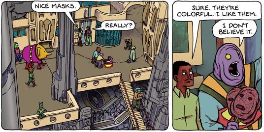 And his depictions of the many alien races that inhabit his story are just fantastic. All different variations of well designed and drawn characters. Imaginative and interesting.